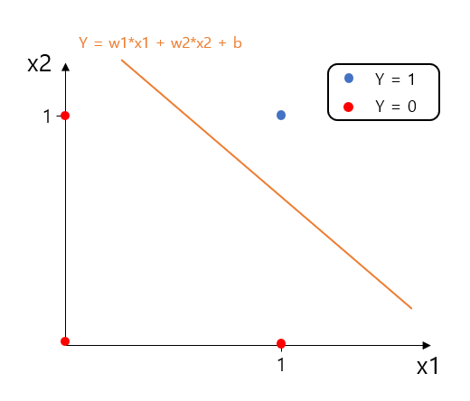 이렇게 input이 들어 올때, linear algebra를 사용하여 예측 값인 Y의 0 과 1 영역을 다음 그림과 같이 나눌 수 있다.