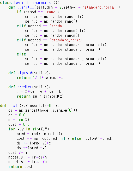 위의 내용을 토대로 Logistic regression을 구현하면 다음과 같다. (python3 , numpy 사용)