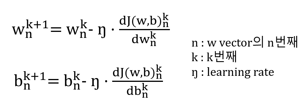 Cost를 감소 시키기 위해 사용되는 방법으로 , w와 b의 변화량에 대한 J(w,b)변화량을 측정하여 다음 w,b를 선정하는 방법으로 식은 다음과 같다.