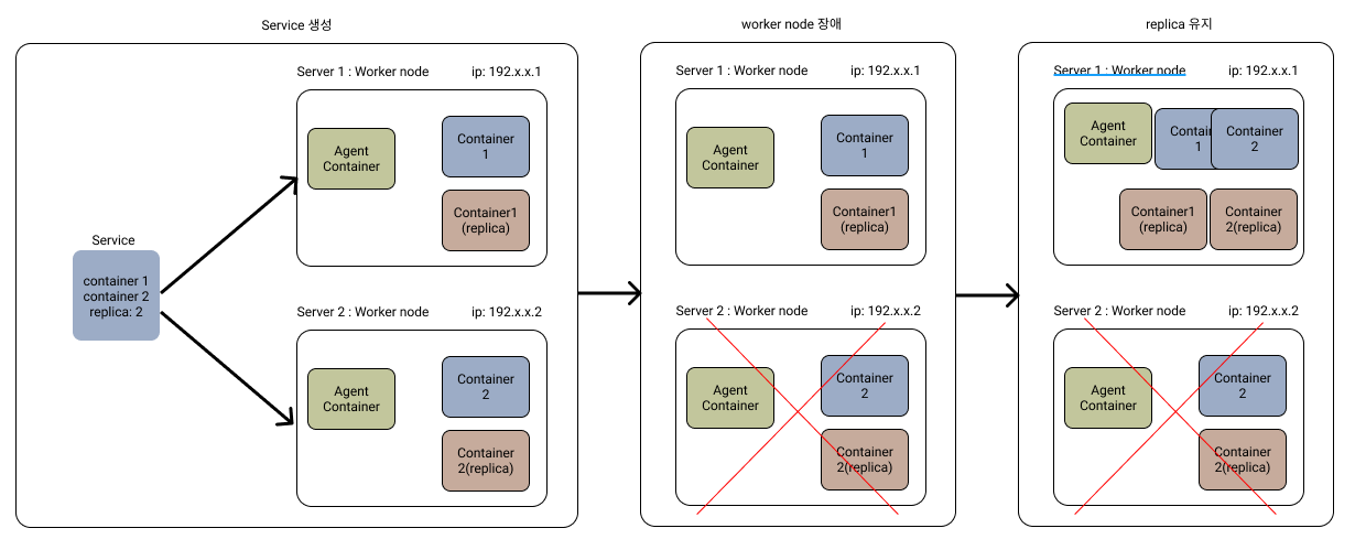 Swarm Mode에서 Manger Node의 절반 이상이 정상적으로 작동하지 못할 경우 Manger Node가 복구될 때까지 클러스터 중단 된다.