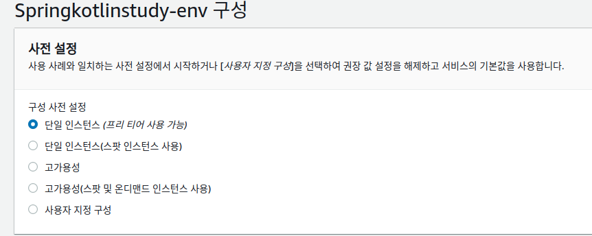 5. 추가 옵션 구성 선택(프리티어 사용할 것이므로 단일 인스턴스 선택 후 저장)