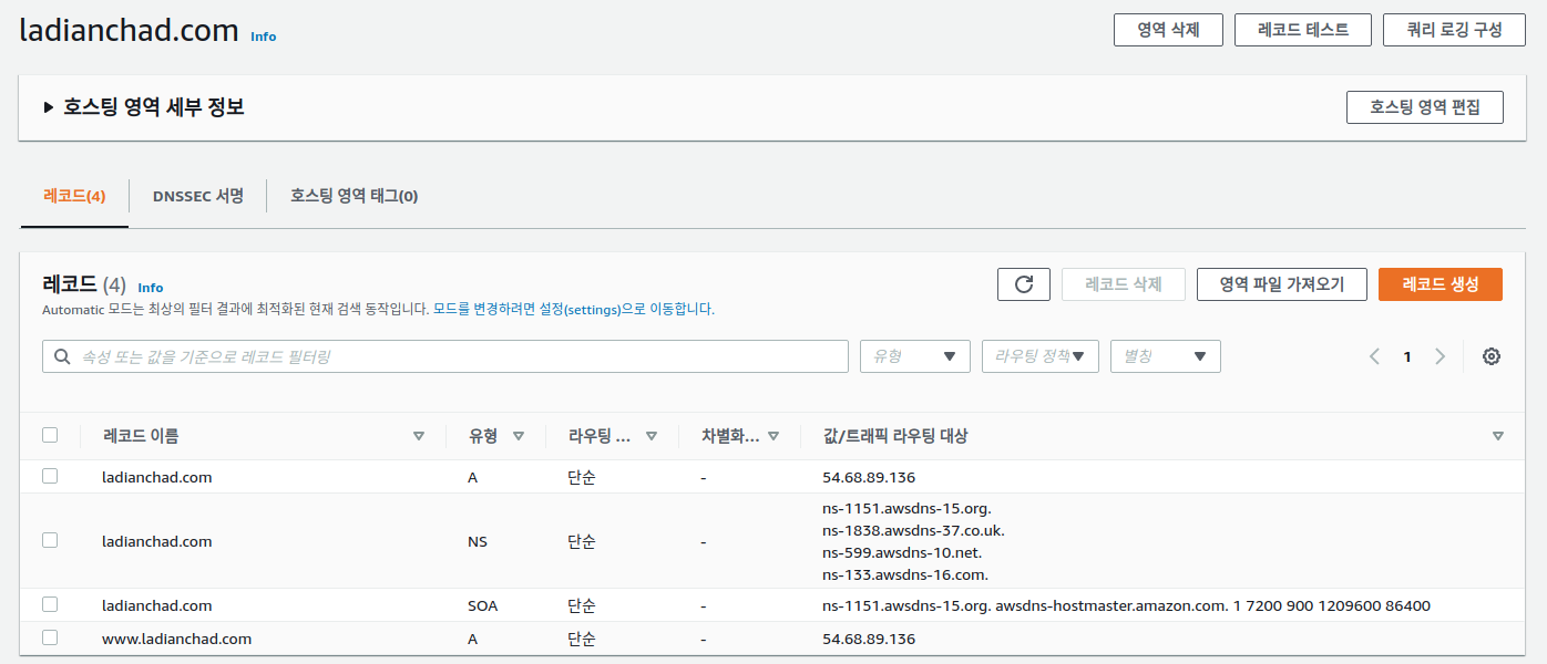기존에 route53에서 구매해 놨던 도메인이 있어 이걸로 호스팅을 추가로 해보기로 했다.