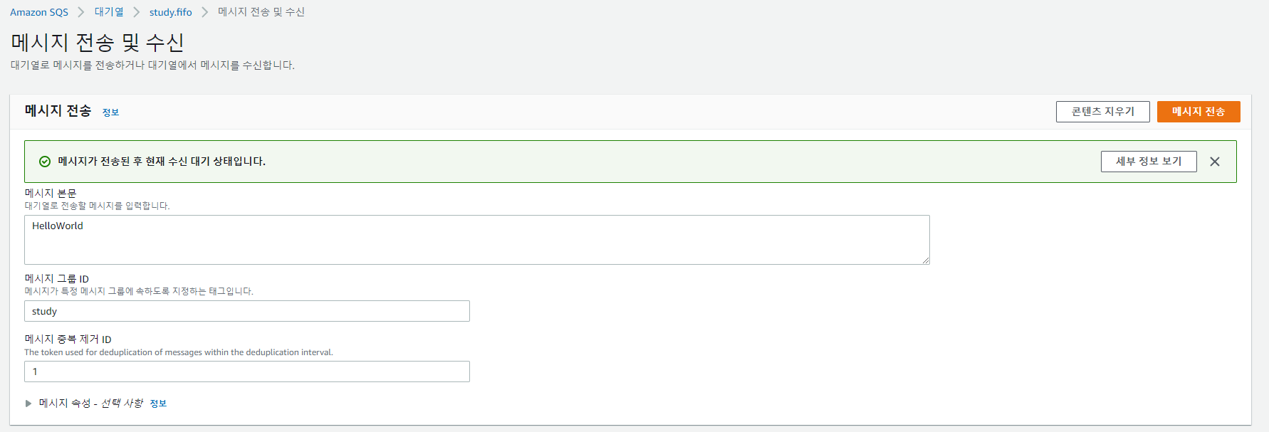 **MessageGroupId 와 MessageDeduplicationId는 필수 항목이며, MessageDeduplicationId는 고유한 값이어야 한다.(중복시 자동으로 message가 삭제 된다.)