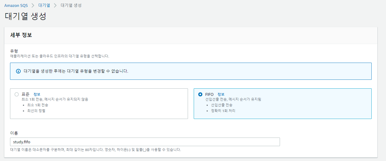 - fifo 선택후 대기열 이름 입력(fifo로 선택하면 무조건 .fifo로 끝나는 이름이어야 한다.) 및 생성 완료