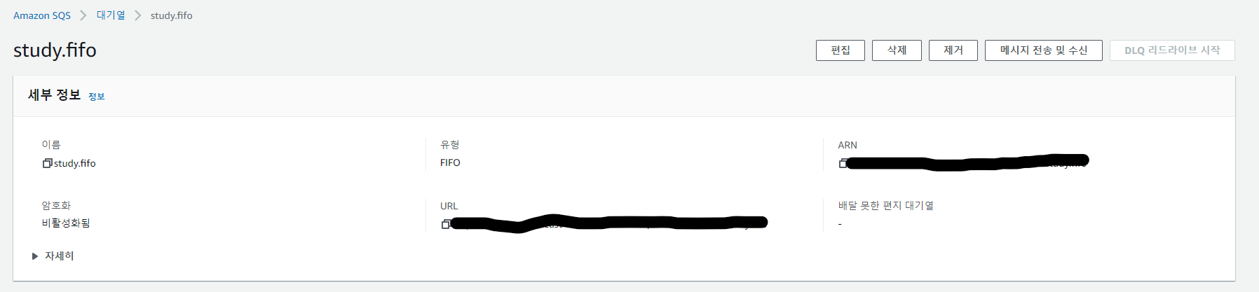 - fifo 선택후 대기열 이름 입력(fifo로 선택하면 무조건 .fifo로 끝나는 이름이어야 한다.) 및 생성 완료