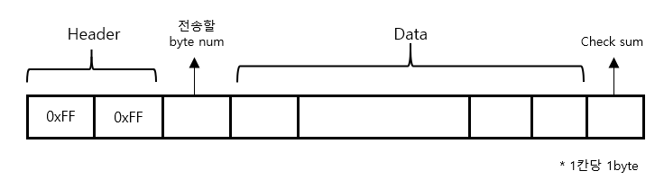 처음 2byte를 데이터가 시작 되었다고 알리는 Header로 고정한다. 그후 앞으로 Data + Check sum 의 수를 알려주는 1 byte를 보낸 뒤 Data를 보내고 Check sum을 보낸다. 여기서 Header란 약속된 0~255 사이의 숫자이지만 Check sum은 앞의 데이터가 중간에 깨지지 않고 잘 갔는지 확인하기 위한 byte이다.
