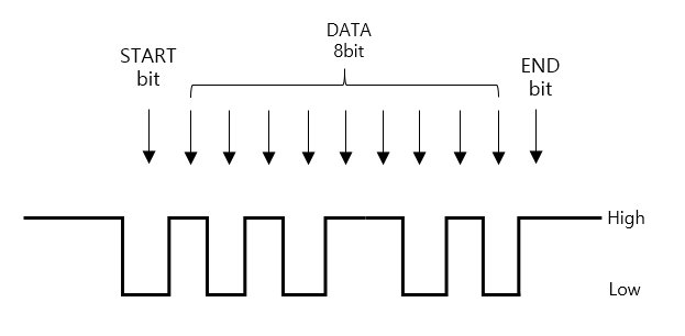 UART는 Start bit (GND , 0)으로 시작하고, 그 뒤 8개의 Data bit , 그리고 Stop bit (VCC , 1)로 끝난다. 따라서 한번에 10개의 bit를 전송하고 받는게 일반적이다.